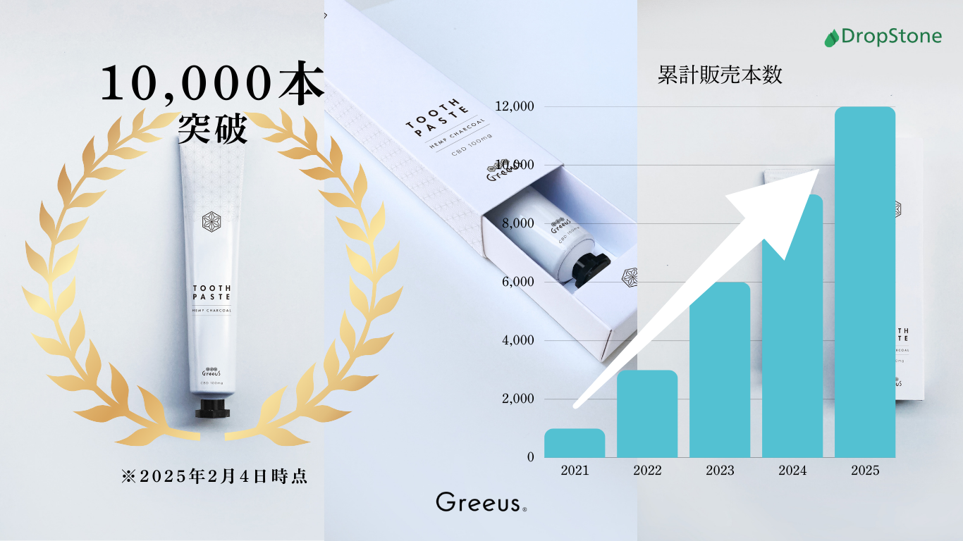 株式会社DropStone(本社:東京都、代表取締役:中川智裕)が展開するウェルネスブランド「Greeus®(グリース)」の「CBD TOOTHPASTE(歯磨き粉)」が、2021年4月12日の発売以来、累計販売本数10,000本を突破いたしました。